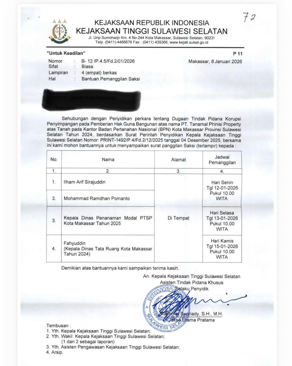 Meski perkara ini diduga terjadi pada saat IAS menjabat sebagai walikota Makassar beberapa tahun yang lalu, jejaknya rupanya tak sepenuhnya hilang. Dokumen resmi dari Kejati Sulsel yang kini beredar luas menyebutkan telah melakukan pemanggilan terhadap IAS dan DP pada Senin (12/1/2026), serta beberapa mantan pejabat pada masa kepemimpinan IAS juga dipanggil untuk dimintai keterangan sebagai saksi dalam kasus dugaan penyimpangan penyalahgunaan kewenangan dan penguasaan tanah negara yang berpotensi merugikan keuangan negara hingga miliaran rupiah.